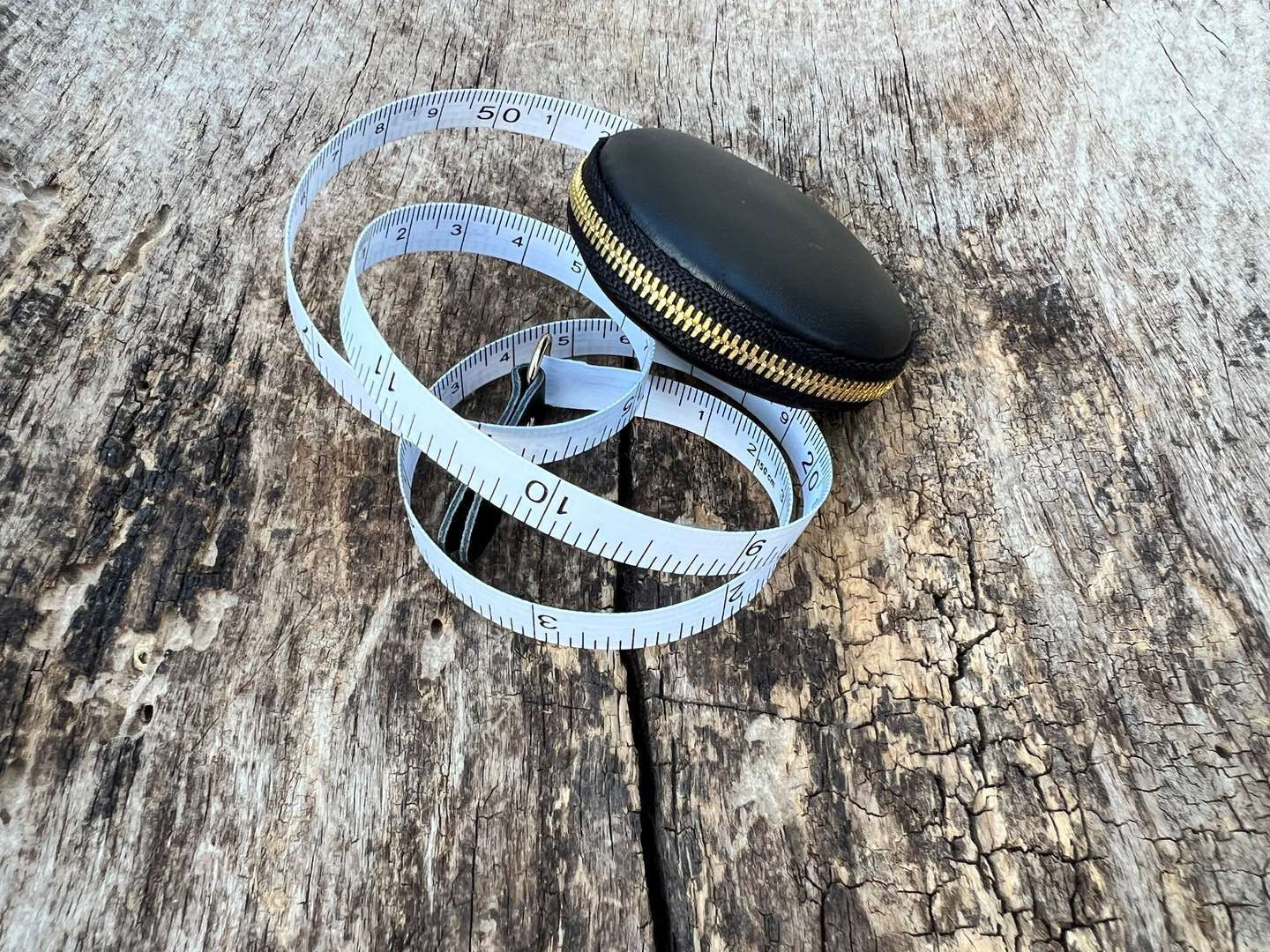 Rullmåttband i svart läderimitation från Hemline gold. Måttbandet har en vacker guldfärgad dragkedja.