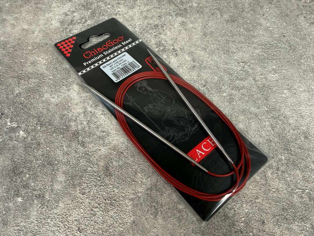 ChiaoGoo SS RED Lace är fasta rundstickor i rostfritt stål med spetsiga tippar, tillgängliga i sex längder från 40 till 150 cm. De är utrustade med samma välkända röda, minnesfria kabel, smidiga övergångar och höga kvalitet som originalserien RED.