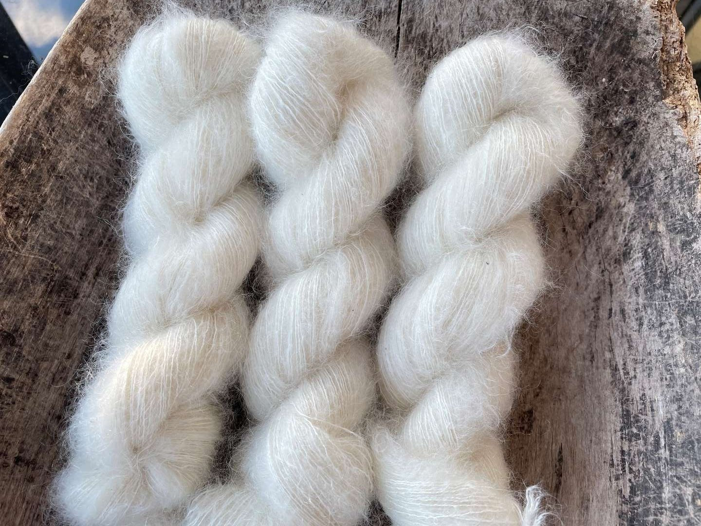 Man har tagit den allra finaste delen av mohairen från unggetter (super kid) samt tillsatt mullbärssilke. Mohair kommer från angorageten och är en mycket slitstark och elastisk.