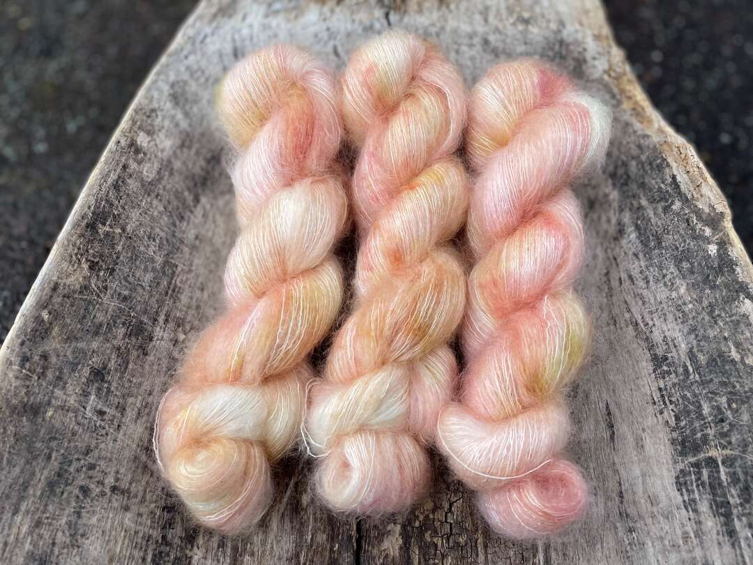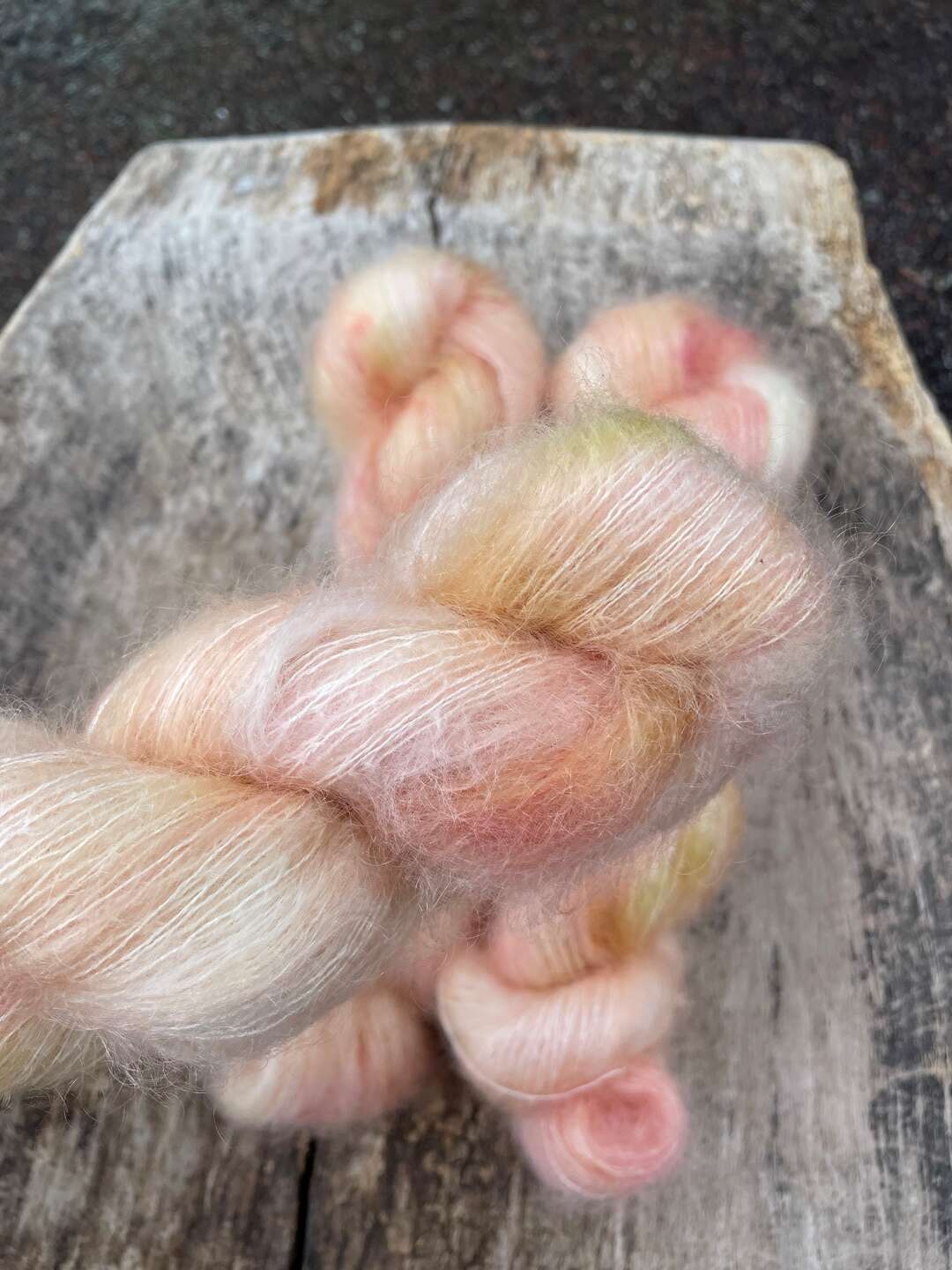 Man har tagit den allra finaste delen av mohairen från unggetter (super kid) samt tillsatt mullbärssilke. Mohair kommer från angorageten och är en mycket slitstark och elastisk.