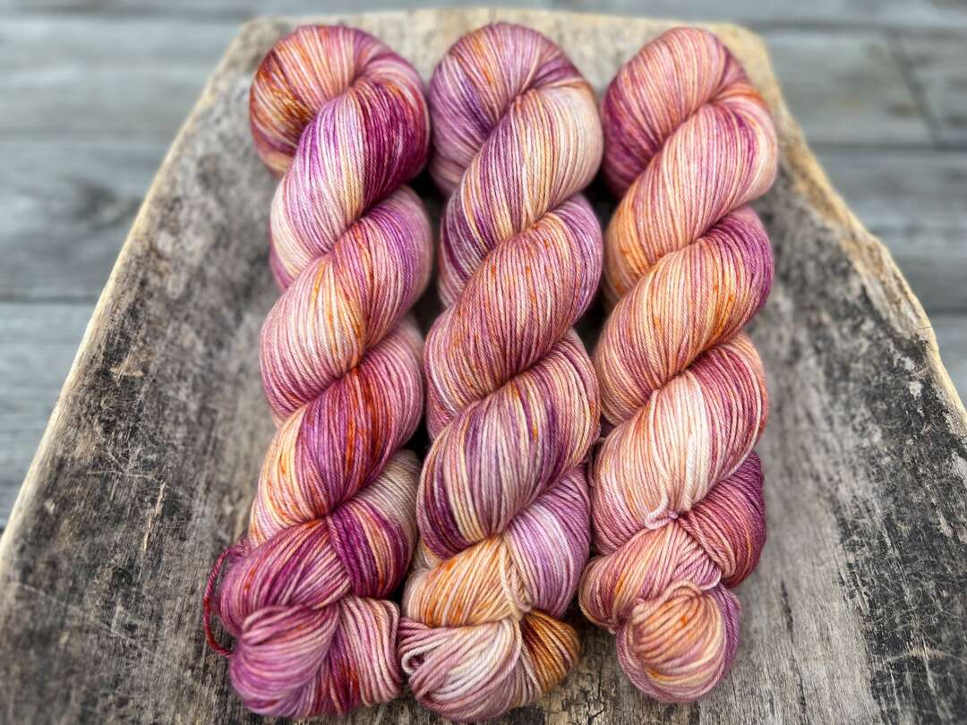 Tänk på att handfärgade garner kan "fälla" lite färg vid första tvättarna. Jag försöker alltid ta bilder som speglar verkligheten så mycket som möjligt. Men det kan skilja en del beroende på skärm mm. Då garnet är handfärgat blir aldrig härvorna exakt lika, därför kan verkligheten skilja mot bilden. Jag rekommenderar dig att varva härvorna vid större projekt.