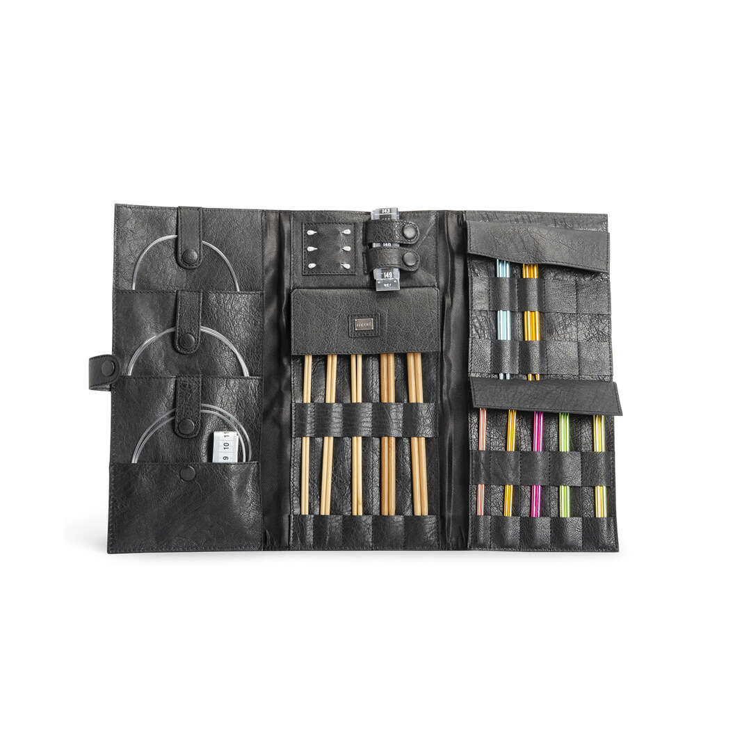 Placera dina minsta stickor och rundstickor i vänster och höger ficka. Använd mittsektionen för dina större stickor– upp till 21 cm långa.