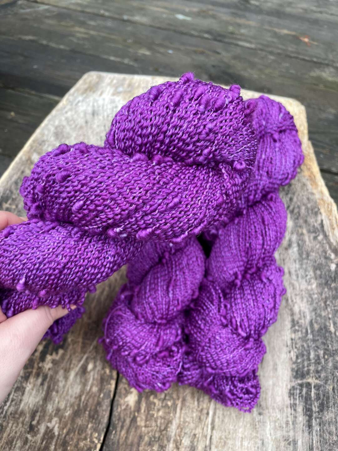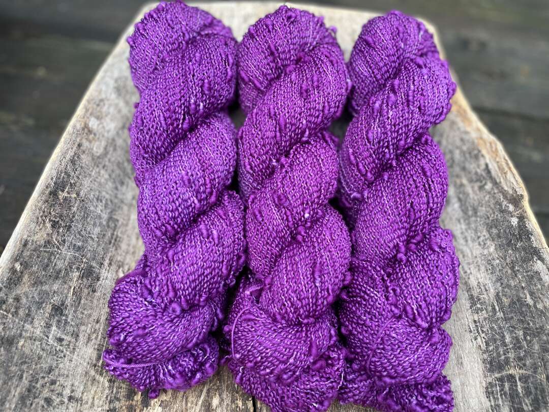 Garnet är döpt eller tekniken man använder vid spinning. Slub, vilket är att göra garnet medvetet ojämnt. Du får ett fantastiskt levande tyg oavsett om du använder garnet för sig eller tillsätter en tråd mohair. Min favorit är att ta 2 trådar slub fingering ihop med en tråd mohair. Sticka ca 5,0. Det blir verkligen magiskt.
